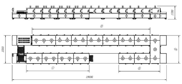 2)②產(chǎn)品固化段總長(zhǎng)為20米,分三段(有2米段和2個(gè)3米段組成)。每段有2個(gè)/3個(gè)加溫區(qū)(每個(gè)加溫區(qū)為1米,加熱管為6根(600W),烤箱風(fēng)機(jī)一個(gè)(370W),四個(gè)觀察門(mén),內(nèi)部方管焊接,保溫棉材質(zhì)為石棉硅酸鋁)。